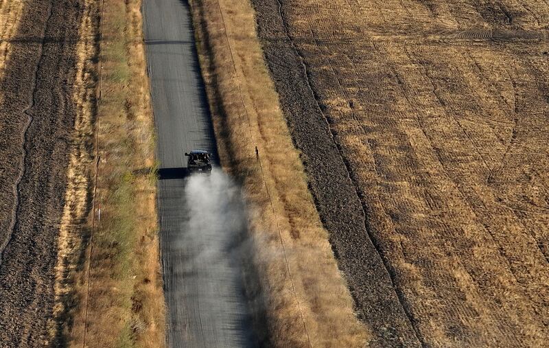 A car drives on a dirt road next to a parcel of land that was recently purchased near Travis Air Force Base by Flannery Associates.
