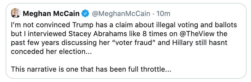“I’m not convinced Trump has a claim about illegal voting and ballots but I interviewed Stacey Abrahams like 8 times on @TheView the past few years discussing her ‘voter fraud’ and Hillary still hasnt conceded her election…” McCain tweeted, adding, “This narrative is one that has been full throttle.”
