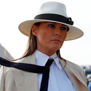 Melania’s boater hat sat sharply tilted to the left, shielding her eyes from photographers, even though her usual deadpan never gives much away. The loss of her peripheral vision may explain why Melania gripped her husband’s hand while attending a remembrance ceremony at Westminster Abbey. (The first lady has previously evaded—or even swatted away—her husband’s attempts at public intimacy.)
