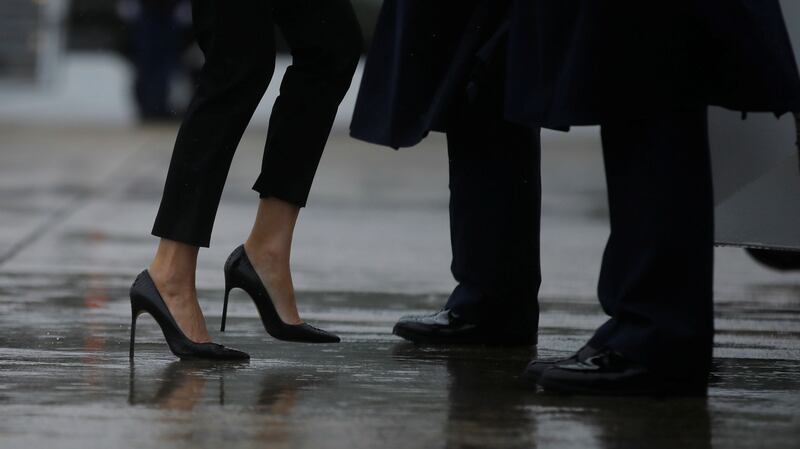 First lady Melania Trump's shoes are seen as she boards Air Force One with U.S. President Donald Trump (unseen) for travel to Texas to visit the areas devastated by Tropical Storm Harvey, the first major natural disaster of his White House tenure, from Joint Base Andrews, Maryland, U.S., August 29, 2017.