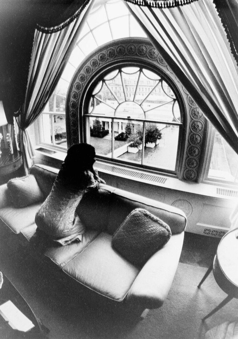Looking down over the West Wing from the living room window of the private White House residence, Betty Ford catches a glimpse of her husband as he walks out of the Oval Office. David Hume Kennerly took the photo in December 1975.