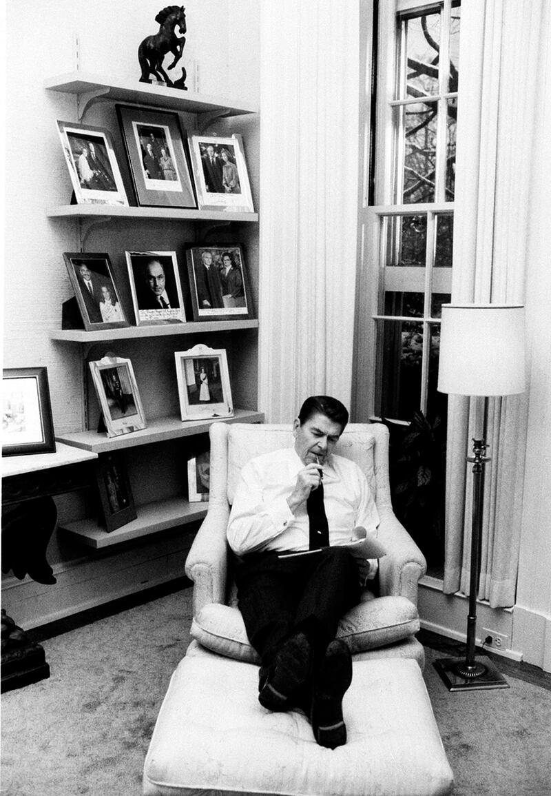 U.S. President Ronald Reagan works on his inaugural address in his private study off the Oval Office in the White House in Washington, D.C., Jan. 19, 1985. (AP Photo/Pete Souza/White House)