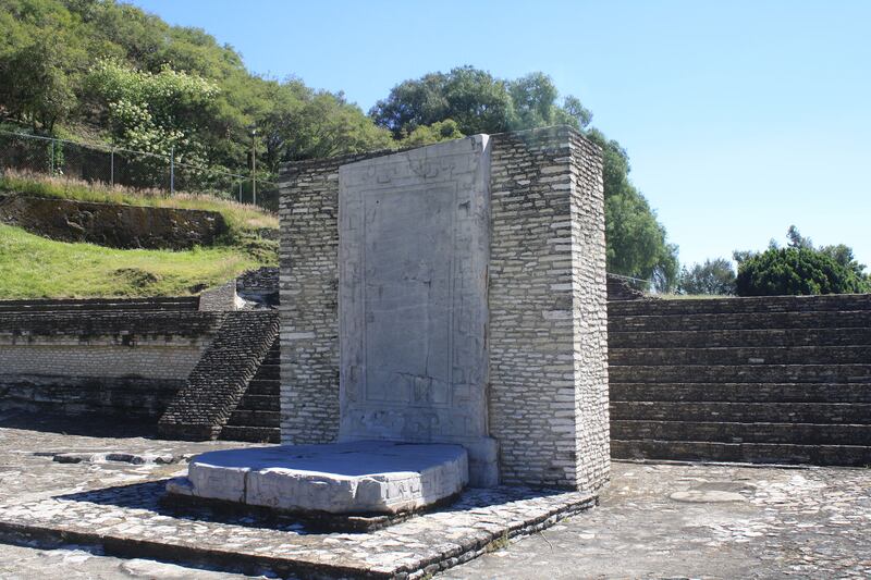 Upon exiting the pyramid tunnels, visitors find themselves at the entrance to a large archaeological site dubbed the Patio of the Altars. In a clearing within the dig, a 10-foot-tall stela (an upright slab of stone with inscriptions) faces a (by my estimate) 10-by-10 stone altar. These hulking blocks of stone are in fact the key to Plunket and Uruñuela’s theory about Cholula and the Great Pyramid’s role at its peak.
