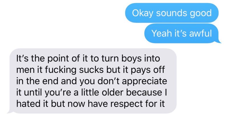 “It fucking sucks,” he continued, “but it pays off in the end, and you don’t appreciate it until you’re a little older.”