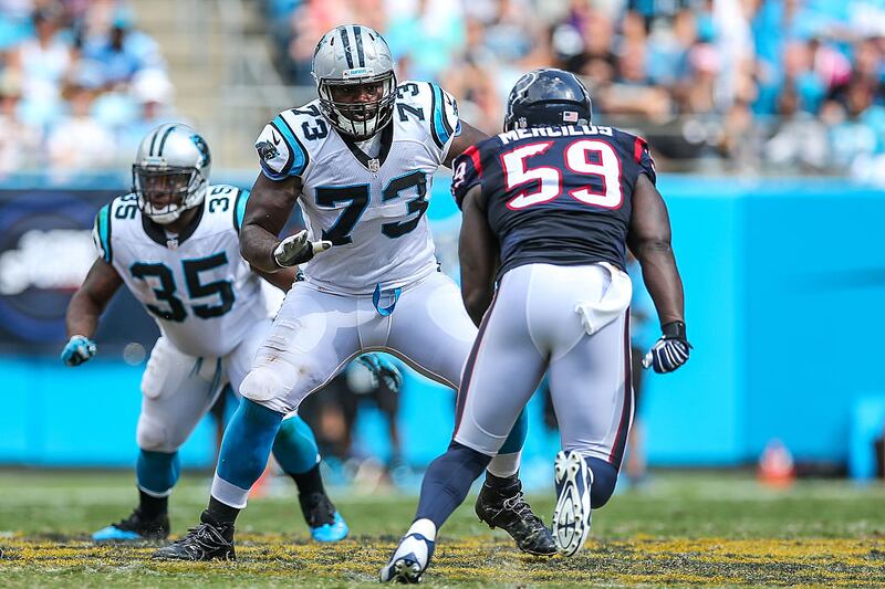 Then-Carolina Panthers tackle Michael Oher blocks Houston Texans outside linebacker Whitney Mercilus.