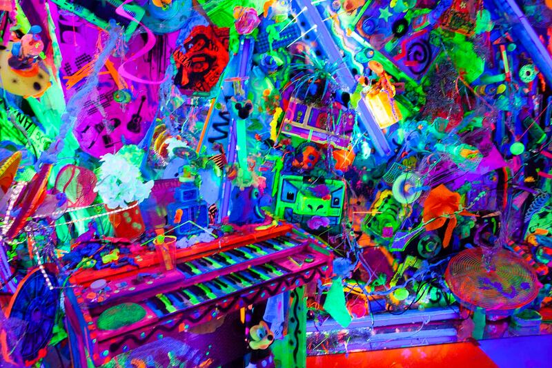 There’s the original work from Amanda Ross-Ho, who contributed an oversized version of the classic Mickey ringer t-shirt that is roughly twice the size of a normal adult. Kenny Scharf debuts an entire neon acid trip room, the Cosmic Cavern, inspired by, of all things, the classic Mickey wrist watch.