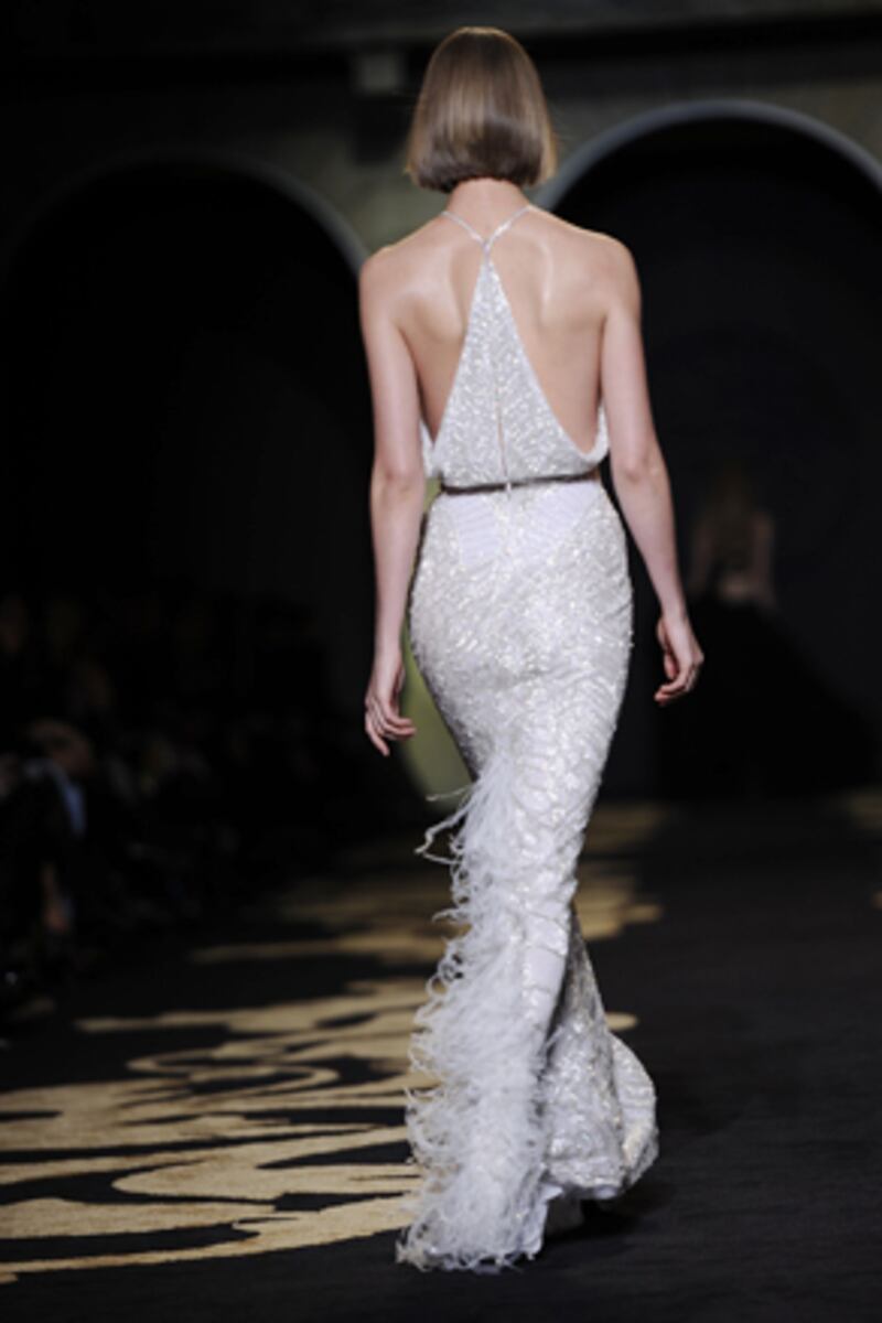 This collection seemed to do it all—from functional separates to bold, look-at-me party dresses. Dresses came in all lengths and colors, from those with a stark silhouette that recalled military uniforms—to brighter dresses embellished with flowers. Pops of color came in the form of a green fur neck-wrap, a purpled belted dress, and—a collection highlight—a yellow mini-fringe dress that shook as the model strutted down the runway. Then, of course, came the high-wattage gowns for evening: with great feathered plumes, slits up-to-there, and corset tops. After the fashion at this year's Academy Awards, one thing's for sure: next year could benefit from a bigger dose of Versace.