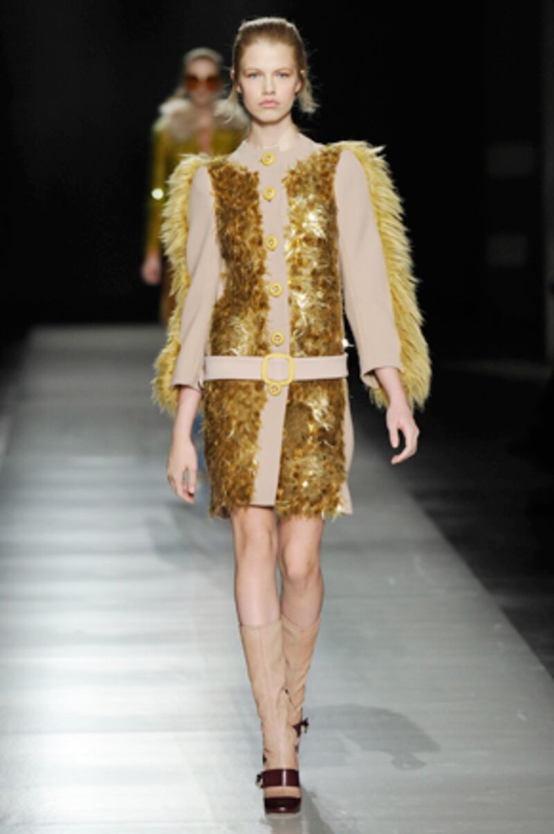 This season saw cocoon coats at Marni, low-belted dresses at Prada, and curtain-skirts at Jil Sander. At Pucci: cleavage. Lots of it. Peter Dundas' collection, which showed Saturday in Milan, featured figure-hugging dresses in forest green with appliqué lace peaking out the top. The house's signature bold prints were more subdued this season, and evening featured gold brocade on black velvet. As WWD wrote of the collection: "These are clothes for extroverts with perfect bodies and bank accounts."