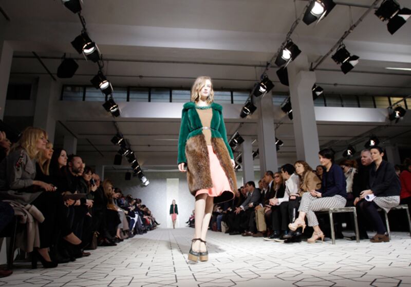 At Marni, designer Consuelo Castiglioni tread a line between zany and luxe: color-blocked dresses were paired with belted fur coats, chunky wooden heels, and large beaded statement necklaces. A striped and beaded dress was paired with a fur coat, over which came a cropped shearling jacket. The explosion of texture was matched by an explosion of color and print, as geometric shapes blanketed the runway. As Cathy Horyn wrote of the collection: "If you have burned out on Marni in recent seasons, you might want to take a look at this collection."