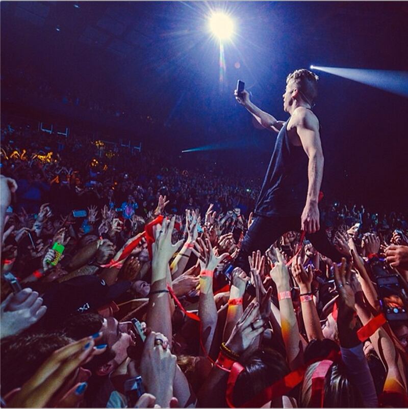 Rapper Macklemore gives a lesson in how to take the ultimate selfie at a concert of his this week.
