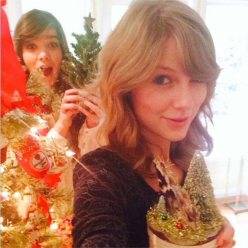 Music superstar Taylor Swift posted this selfie at a holiday party she threw. That's Oscar nominated actress Hailee Steinfeld behind her pulling off an amazing photobomb.