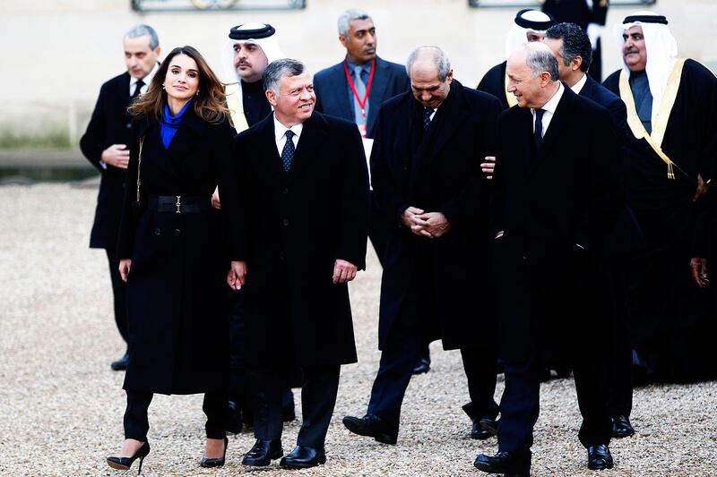 Queen Rania of Jordan, King Abdullah II of Jordan and Laurent Fabius, French Minister of Foreign Affairs and International Development leave the Elysee Palace to attend a Unity rally "Marche Republicaine" on Sunday.