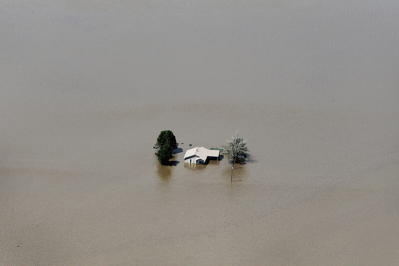 Floodwater engulfs a home after the Army Corps of Engineers blew a massive hole in a levee at the confluence of the Mississippi and Ohio Rivers to divert water from the town of Cairo, Illinois May 3, 2011 near Wyatt, Missouri. The diversion flooded about 130,000 acres of Missouri farmland and 100 homes in the state. Heavy rains have left the ground saturated, rivers swollen, and has caused widespread flooding in Missouri, Illinois, Kentucky and Arkansas.