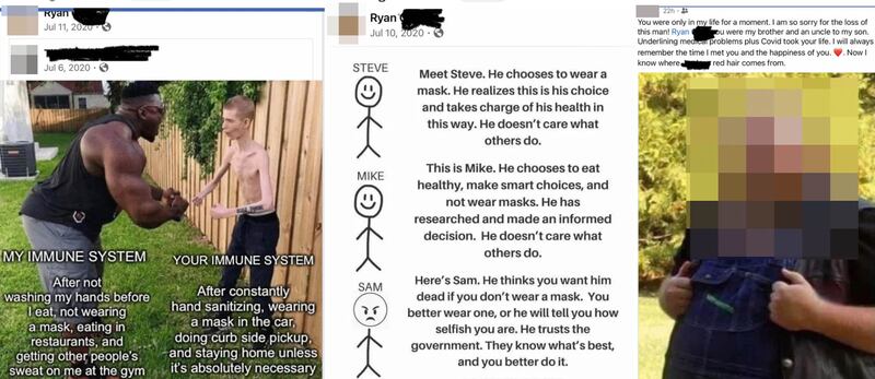 First and last names, and faces of the deceased, are prominent on the site, as is editorializing from the proprietor, who is especially hard on people with goatees, an established cultural signifier for working-class conservatism. “Unvaccinated with a goatee like that... he didn’t stand a chance,” reads a post about one person who appears to have died on Sept. 21 and won’t be named here.