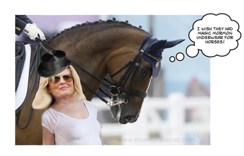 On the website’s homepage, Mitt’s head is glued on to a model’s body, dressed in a white T-shirt and what looks to be tight white briefs, with the following thought bubble: “I’m just glad they didn’t release the secret video of me dancing in my Magic Mormon underwear!!!” On another page, Ann is clumsily Photoshopped onto the body of a model wearing a very sheer white T-shirt, leaning against a dressage horse.“I wish they had Magic Mormon underwear for horses,” the horse thinks.
