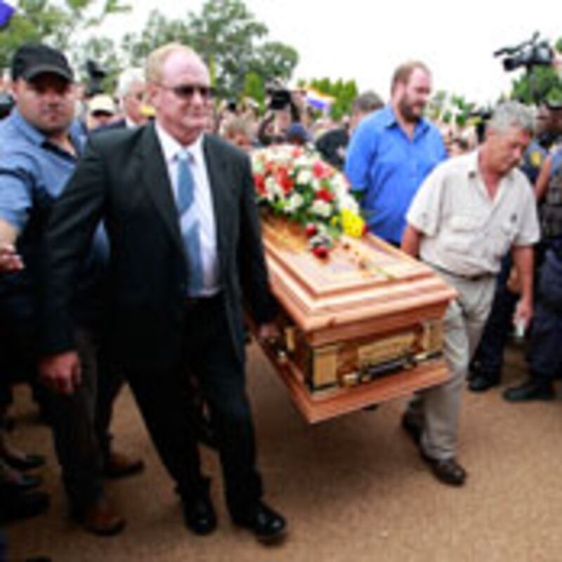 A few days before the funeral, hundreds of white farmers had demonstrated at the court hearing for the accused in Terre'Blanche’s murder. Scuffles broke out when a white woman threw a soda at one of the black spectators, and white farmers began to sing “Die Stem,” the apartheid-era national anthem. Police had built a barricade of razor wire to keep the two groups apart.