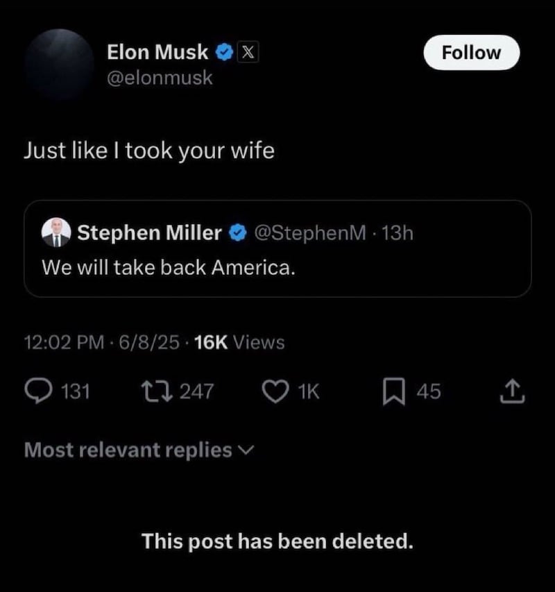 However, Stephen Miller quickly turned on Musk amid his very public and explosive fallout with Trump, which also happened just days after news broke that his wife had left her government job to work with Musk.
