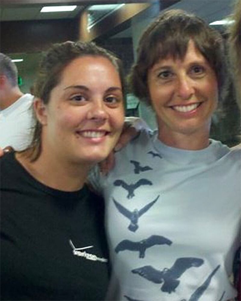 Erica Lafferty, right, hugs her late mother, Dawn Lafferty Hochsprung.
