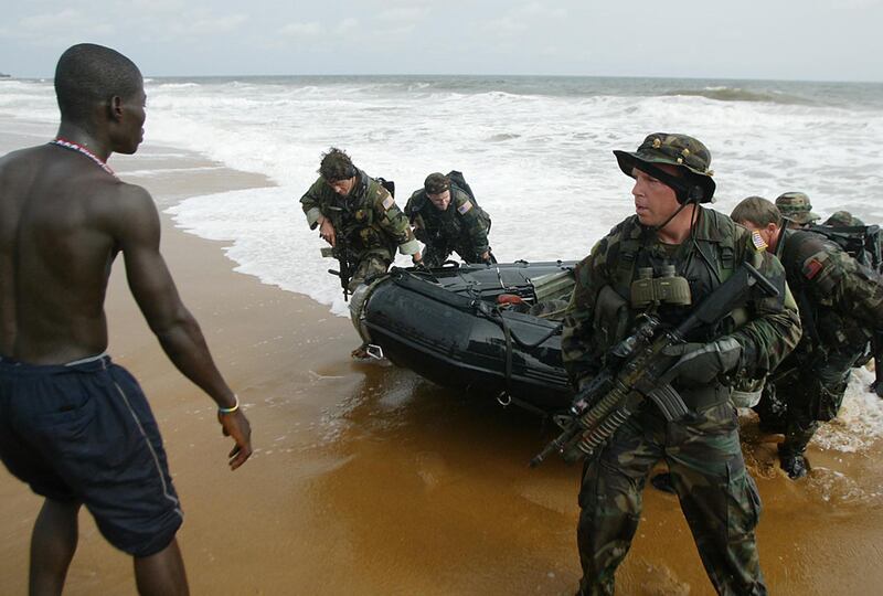 American Navy SEALs land on the main beach in Monrovia, Liberia, Aug. 18, 2003.The local population appeared surprised when around 15 SEALs joined a peacekeeping effort.