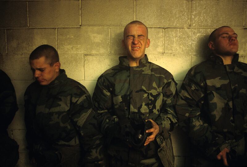 Three Navy SEALs stand against a wall momentarily exposed to tear gas during training in Coronado, California.
