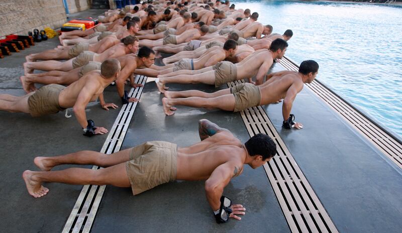 Navy SEAL trainees do push ups prior to taking the Drown Proofing Test at the Combat Training Tank.