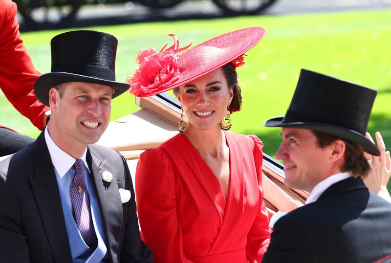 Britain's Prince William, Catherine, Princess of Wales and Edoardo Mapelli Mozzi are pictured during the royal procession ahead of the day's races.