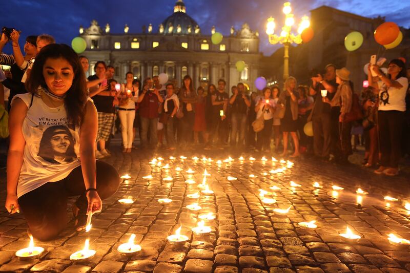 People gather in St. Peter’s Square to mark the 30th anniversary of the disappearance of Emanuela Orlandi, on June 22, 2013, in Vatican City, Vatican.