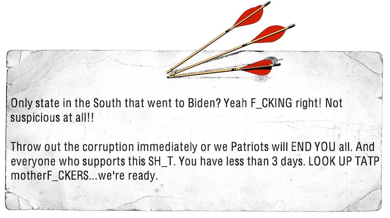 Those death threats would continue for weeks, unsurprisingly citing Trump’s rhetoric. On the same January weekend that Raffensperger got the call from Trump, local election officials—who were preparing for runoff elections that would eventually determine the future of the U.S. Senate—were reeling from a string of identical emails threatening to bomb polling places.