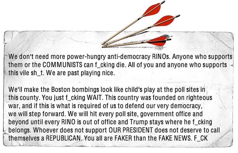 “This election is f-cking rigged… We are past playing nice,” said the rambling email, which included a threatening reference to TATP, the popular homemade explosive made of triacetone triperoxide.
