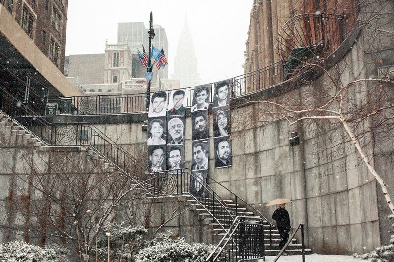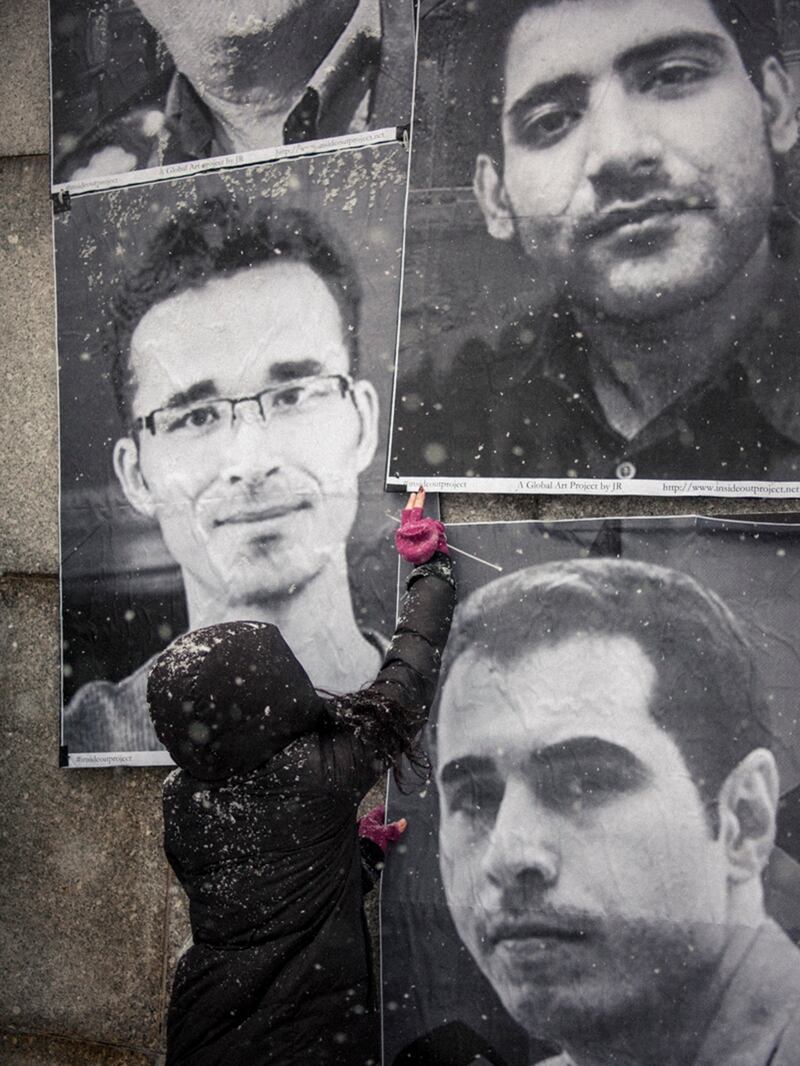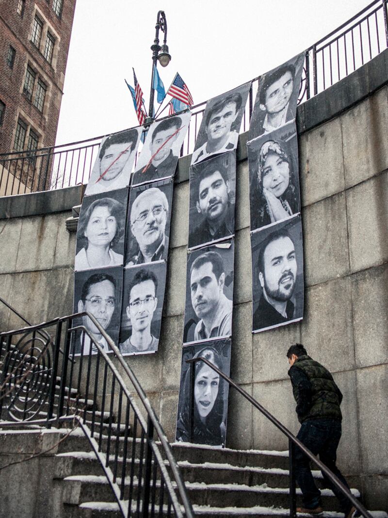 Early Tuesday morning, as snow fell on New York City, representatives of Unlock Iran and the photographic Inside Out Project posted 11 portraits of imprisoned Iranian activists—teachers, lawyers, journalists—and two of recently executed activists, including poet Hashem Shabani, prominently on a wall across the street from the United Nations Headquarters.