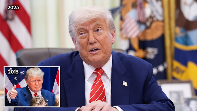 Trump is a brand, and like Clorox or Twining’s Tea, he can’t change his packaging. Ten years on, his hair is grayer (depending on the day), but the navy suit, white shirt, red tie, and flag pin remain.
