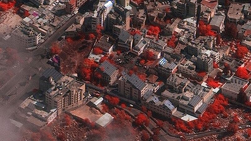 Closer view of Al Ahli Hospital after explosion, color infrared image.