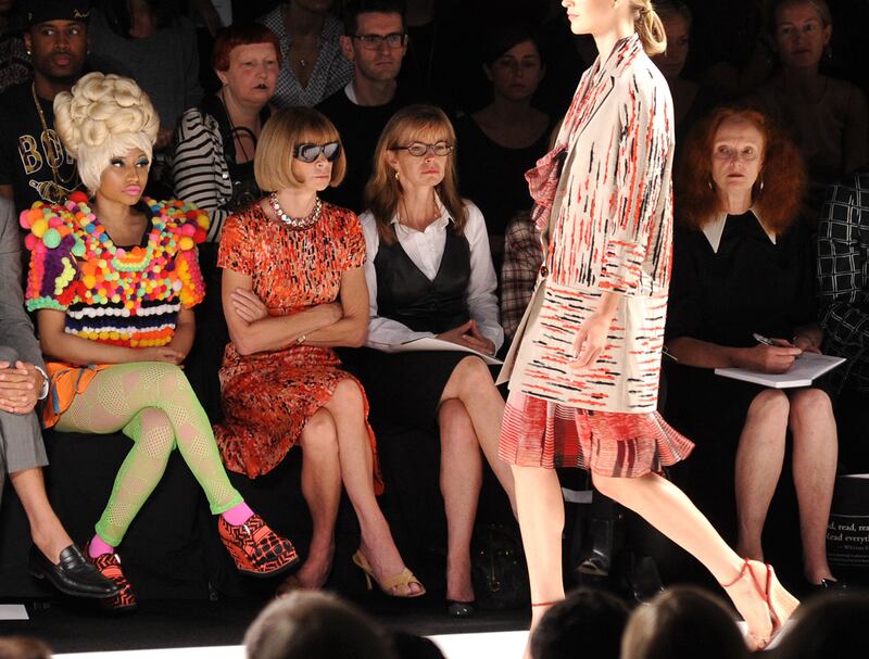 Anna Wintour got a dose of bright color at Carolina Herrera’s show on Monday morning—even before the show had begun. The Vogue editor was seated next to the rapper Nicki Minaj (well done, seating gurus!), who wore a structured vest made out of rainbow cotton balls, an orange tennis skirt (perhaps a homage to the U.S. Open?), and neon green tights. On Minaj’s other side? None other than W editor Stefano Tonchi, in a perfectly tailored gray suit. And everyone seemed to be getting along—Wintour even leaned across to whisper to Minaj during the show. Elsewhere in the audience were Renée Zellweger and Olivia Munn—both, of course, in Carolina Herrera.