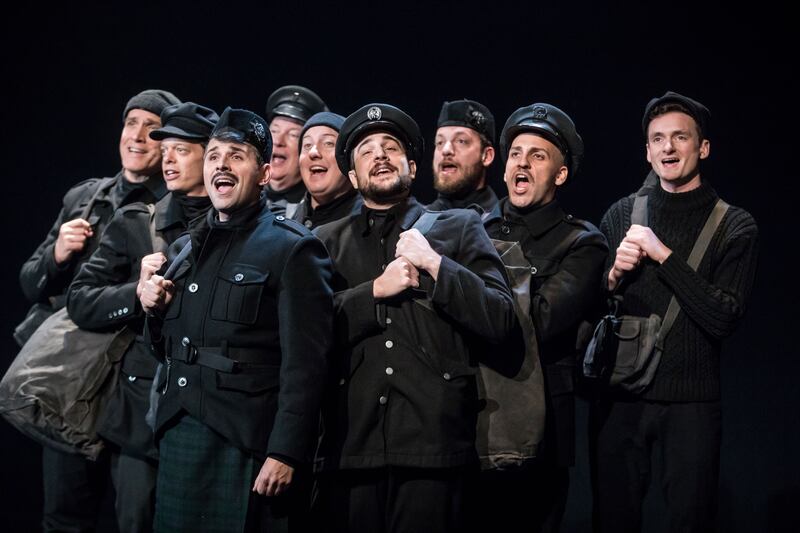This fantastic company of actors—Sasha Andreev, David Darrow, Benjamin Dutcher, Ben Johnson, Mike McGowan, Tom McNichols, Riley McNutt, Rodolfo Nieto, James Ramlet, and Evan Tyler Wilson—sing beautifully in harmony and a capella.