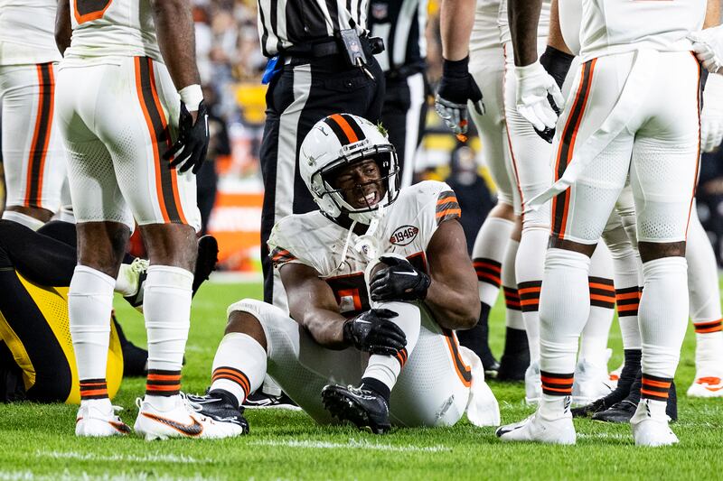 Nick Chubb of the Cleveland Browns reacts after hurting his knee during a game against the Pittsburgh Steelers on Sept. 18, 2023 in Pittsburgh, Pennsylvania.