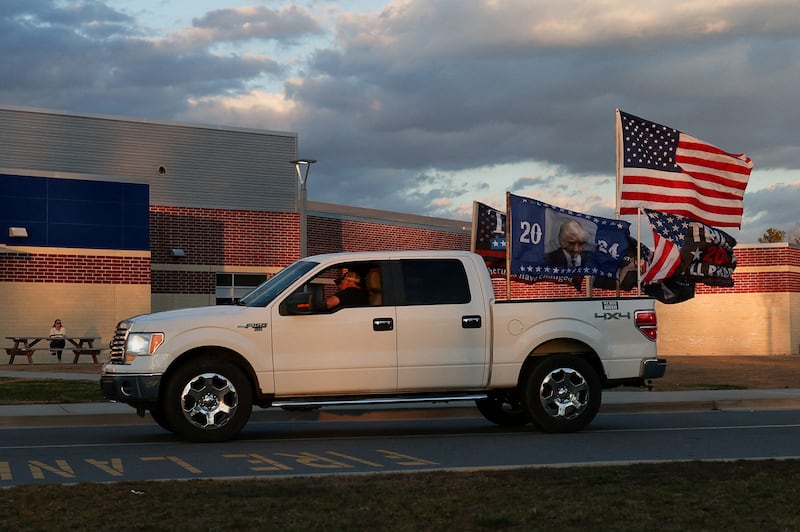 A supporter of former President Donald Trump drives a car outside the Indian Land High School ahead of a campaign event of presidential candidate Nikki Haley, in Lancaster, South Carolina, on Feb. 2, 2024.