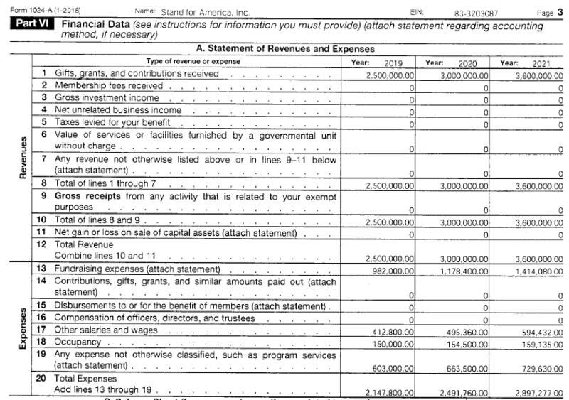 According to the group’s application for tax exemption, Stand for America is looking to bring in $9.1 million through 2021. It anticipates spending about $7.5 million of that cash, and expects that nearly half of all of its expenses will go toward raising money.