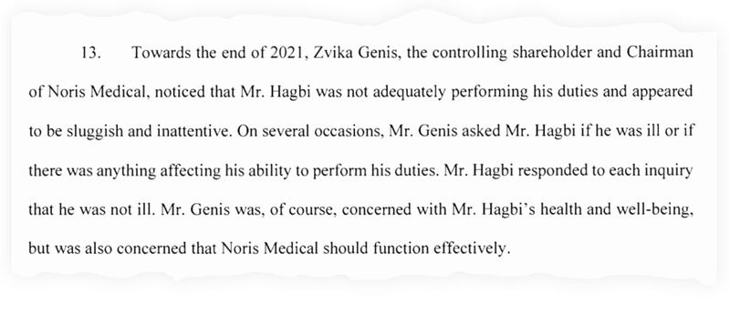 “Towards the end of 2021, Zvika Genis, the controlling shareholder and Chairman of Noris Medical, noticed that Mr. Hagbi was not adequately performing his duties and appeared to be sluggish and inattentive,” states the civil suit, which was filed Thursday in New York State Supreme Court. “On several occasions, Mr. Genis asked Mr. Hagbi if he was ill or if there was anything affecting his ability to perform his duties. Mr. Hagbi responded to each inquiry that he was not ill.”
