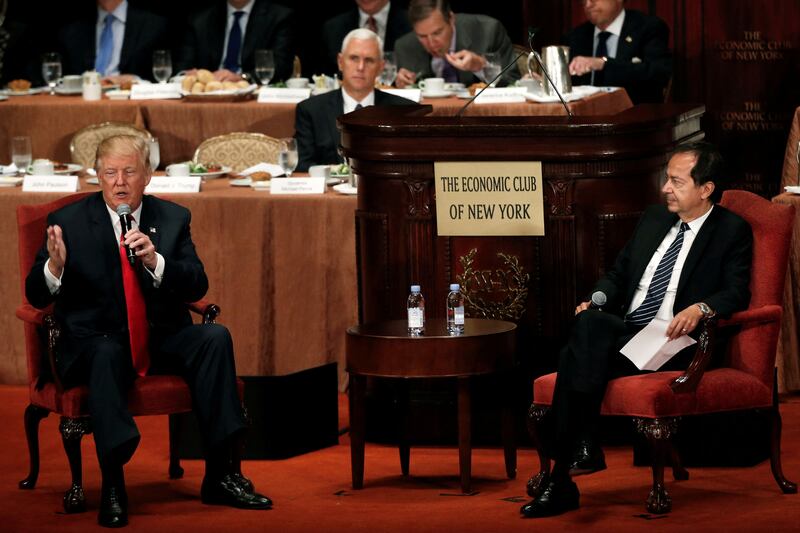 Donald Trump is interviewed by John Paulson at the Economic Club of New York luncheon in 2016.
