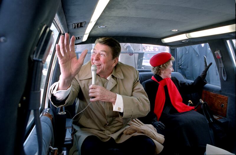 President Reagan and Nancy Reagan in the limousine waving to the crowd in Dixon Illinois, Feb. 6, 1984.