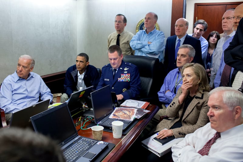 President Barack Obama, Vice President Joe Biden, Secretary of State Hillary Clinton, and others in the Situation Room of the White House observing the raid against Osama bin Laden on May 1, 2011.