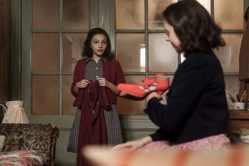 Anne, played by Billie Boullet, receives a gift from Miep, played by Bel Powley, in A Small Light.