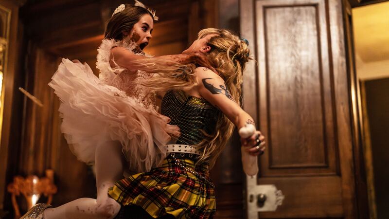 Universal StudiosDecked out in a frilly tutu that nicely clashes with her mouthful of razor-sharp teeth, Abigail is a captivating fiend, and her love of toying with her targets lends the action a bit of devious liveliness. Yet directors Bettinelli-Olpin and Gillett do little with a lot. Despite an elaborate confined setting, a collection of disparate types, and an attention-grabbing villain,Abigail generates no suspense or humor. To make up for those deficits, plentiful gore is sprayed around, albeit to snoozy effect; there’s nothing scary or funny about the decapitations, impalements, and maulings that eventually take center stage. Worse still, Abigail’s ruses are of a pedestrian sort, further rendering this affair a generic supernatural riff on Agatha Christie’s And Then There Were None—a novel that cheekily factors into the finale.