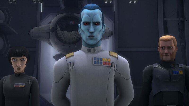 After Disney exiled him from Star Wars canon, Thrawn re-emerged in the official continuity in Dave Filoni’s Star Wars Rebels, where he’s voiced by Lars Mikkelson (who also plays him in Ahsoka). Here, he’s the principal antagonist for Jedi Ezra Bridger (Taylor Gray) and his Ghost Crew, including Hera Syndulla (voiced by Vanessa Marshall and played by Mary Elizabeth Winstead in live-action) and Sabine Wren (Tiya Sircar).