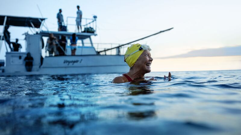 A brief non-fiction prologue recaps Diana’s former marathon-swimming achievements and the celebrity that followed. Into her seventh decade, however, Diana—who’s spent years working as a reporter for, among others, ABC’s Wide World of Sports—craves a new challenge. Well, not exactly new; inspired by old videos of herself, she decides to revisit the swim from Cuba to Florida that she first failed to finish at age 28. This strikes Bonnie as madness, as does Diana’s desire to have her serve as her coach. Nonetheless, Diana is a fearsome competitor who never takes no for an answer and, once her mind is set, refuses to quit, and she’s soon training with Bonnie as well as assembling a team that will help her realize her ends, beginning with gravely boat captain John Bartlett (Rhys Ifans).