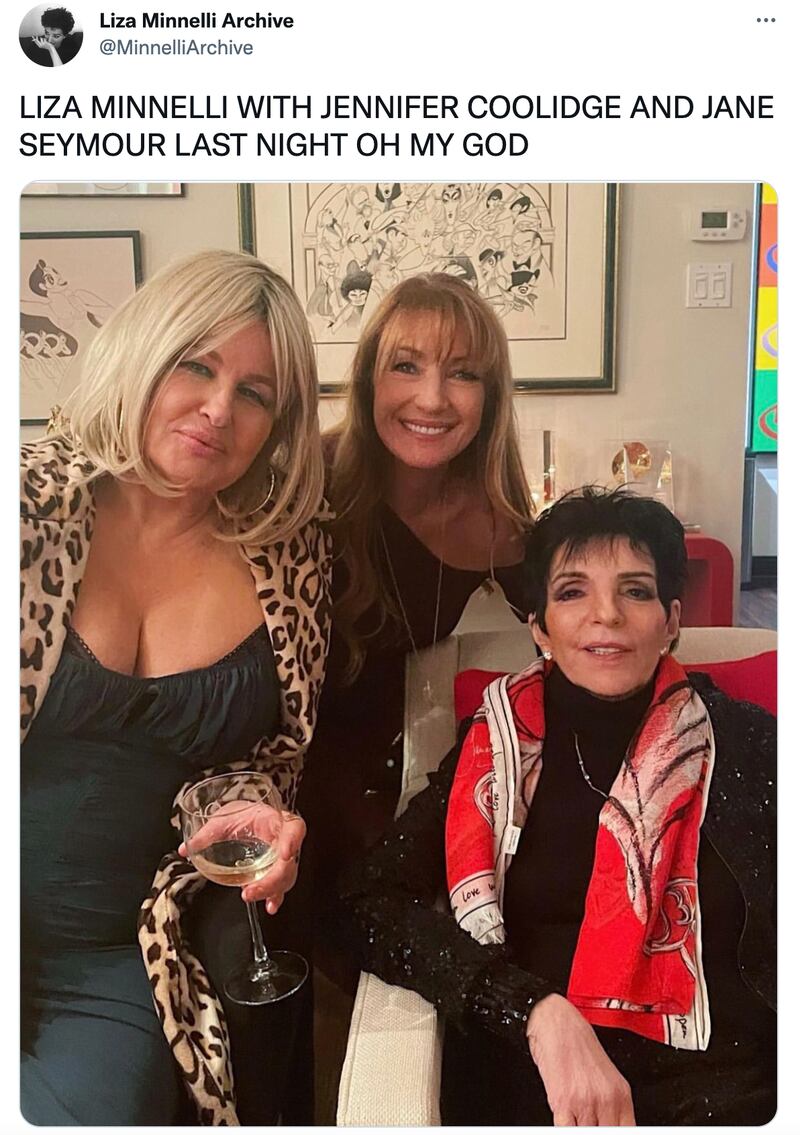 My Christmas present to you is this photo of Jennifer Coolidge, Jane Seymour, and Liza Minnelli hanging out together. Have a safe and happy holiday, everyone.