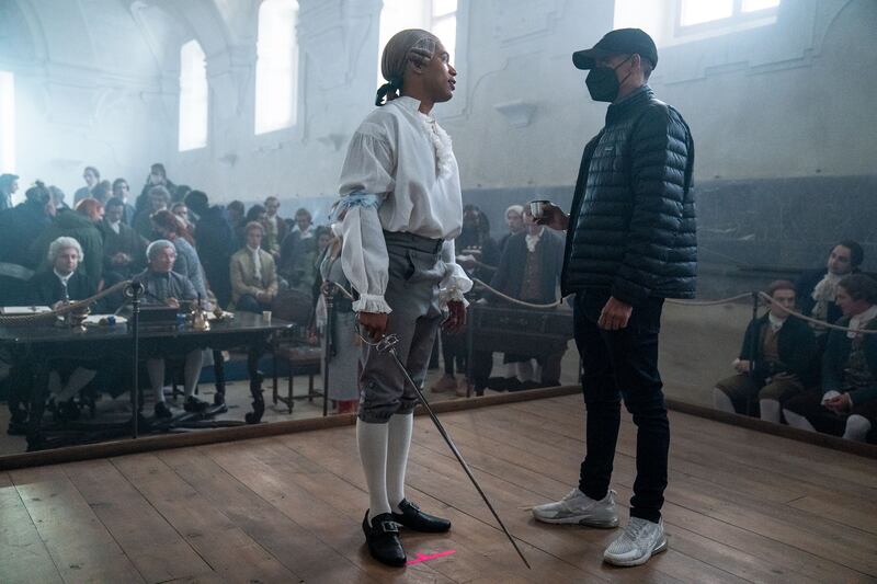 Kelvin Harrison Jr. and Director Stephen Williams on the set of Chevalier.