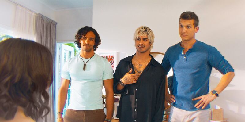 A still from ‘Choose Love’ of Jordi Webber as Jack, Avan Jogia as Rex, and Scott Michael Foster as Paul in a row