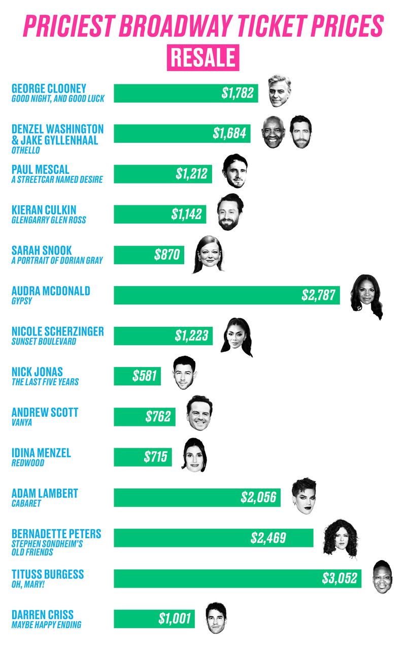 Earlier this week, we tracked down what the top ticket cost was to see each of these stars at the evening performance on Saturday, Mar. 22. We looked at both what the theater charged for its most expensive ticket through its official website and what the highest price was for a resale ticket on Stubhub, including fees, at that moment.