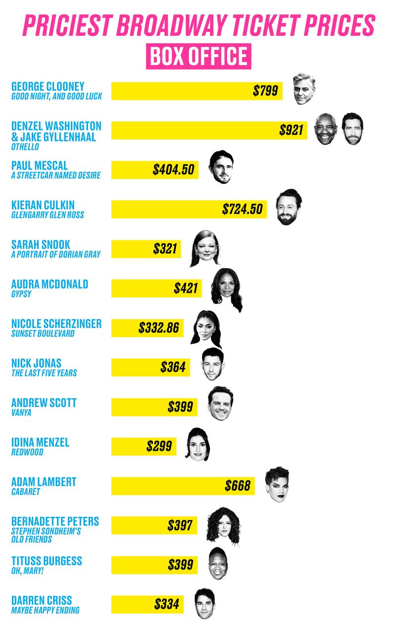 When it comes to baseline prices that theaters are charging, it’s perhaps expected that Othello co-stars Washington and Gyllenhaal come with the highest price tag: $921 for a premium seat. Next in line, Clooney is a downright bargain in comparison, at $799 for Good Night, and Good Luck. Culkin is right up there, though, with Glengarry Gary Ross at $724.50. (That production’s star value is bolstered by Bob Odenkirk and Bill Burr also starring.)